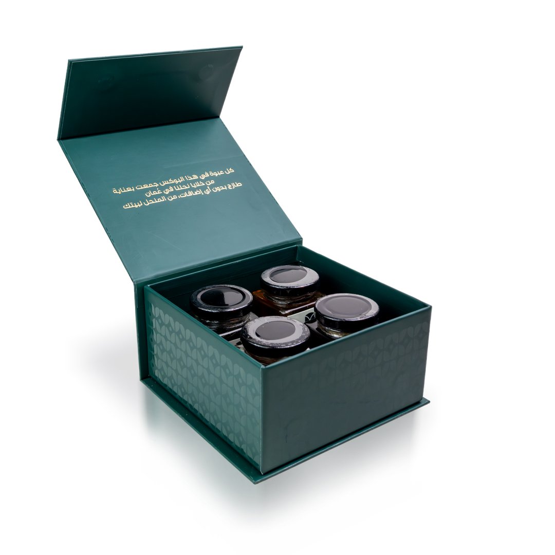 تجمع أربعة من أندر وأجود أنواع العسل العُماني الخام في باقة واحدة جاهزة.